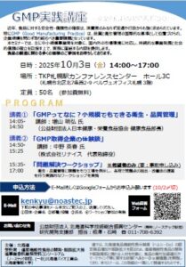 北海道主催セミナー『GMP講座 ~安全と信頼の製造現場づくり~ 』のご案内