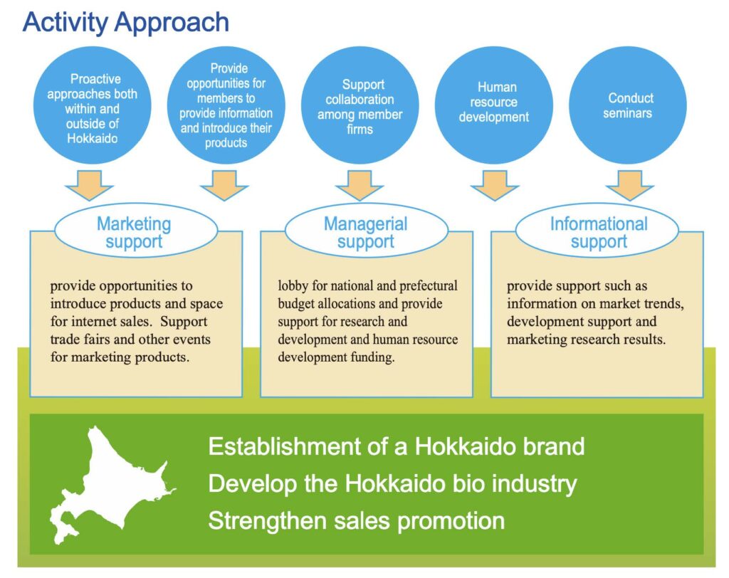 It makes various requests and proposals to the national government and Hokkaido government, with the broad aim of revitalizing and developing Hokkaido's bio industry.